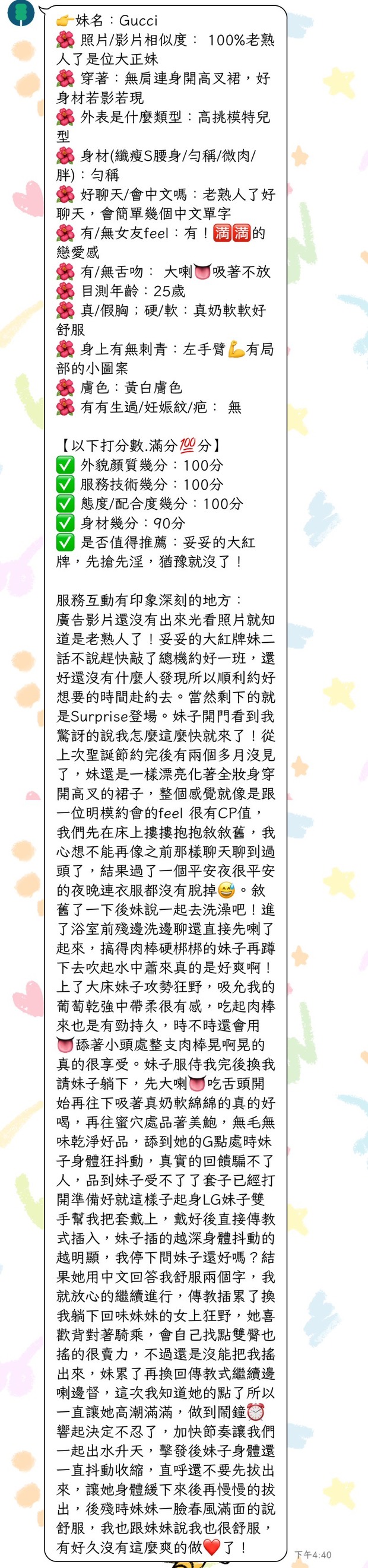 (服務項目) 無妊娠纹 無生過 無牙套 不抽菸 真奶 皮膚白皙 白虎 英文溝通 無套吹 親親 舌吻 胸磨臉 按摩 品鮑 絲襪 舔蛋 胸推 六九 共浴 奶泡 屁推